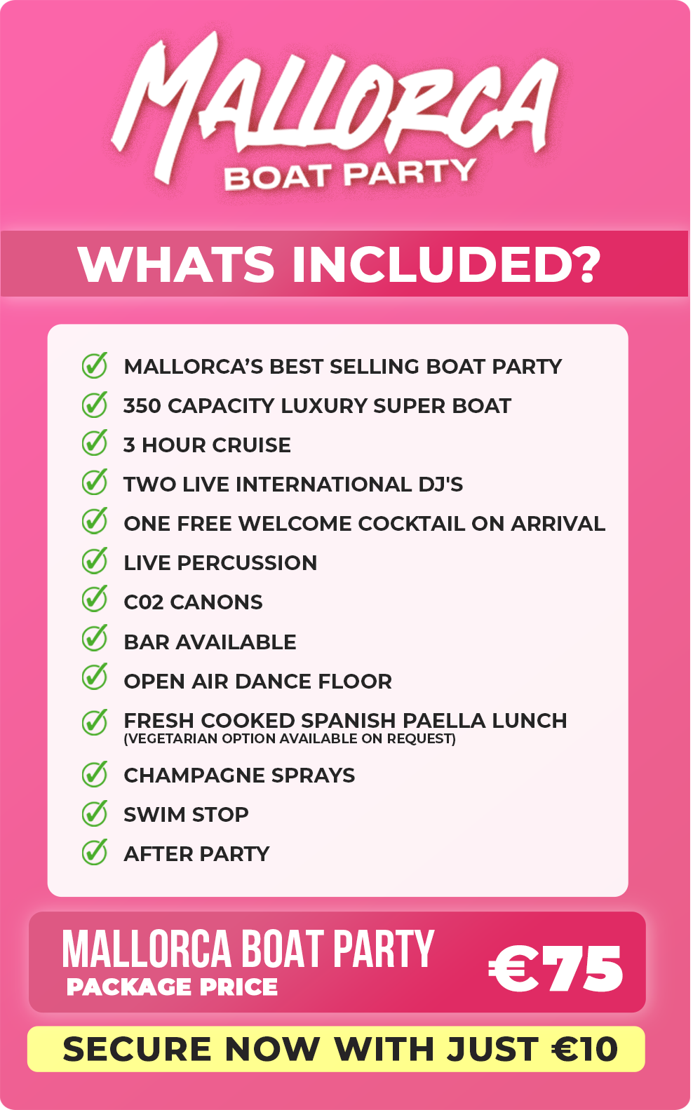 The Mallorca boat party prides itself on being a fully international Boat party- we attract party people from around the globe, including mainly Holland, Spain, German, Italy, French, and the British.